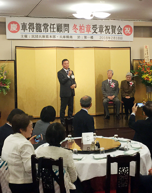 【兵庫】国民勲章「冬柏章」を受章した民団兵庫本部の車得龍常任顧問を招いての祝賀会が18日、神戸市内の中華料理店で開かれた。主催は民団兵庫本部(李圭燮団長)と一社韓商兵庫(辛輝浩会長)。