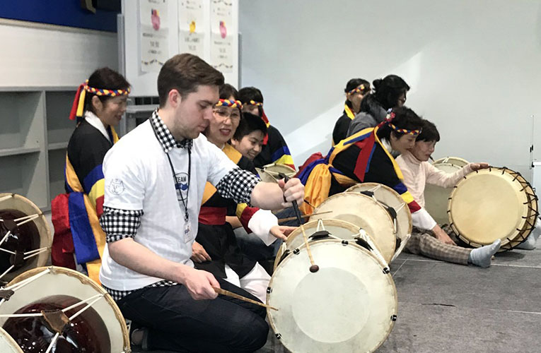 民団香川本部は大小各サイズの韓服を取りそろえた。希望者にはメーキャップのサービス付きで貸し出し、即席ファッションショーも展開した。このほか、サムルノリの演奏を披露。終了後のサムルノリ体験コーナーも好評だった。同本部の韓大圭団長は韓国への理解を深める講演会の講師を務めた。