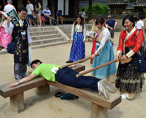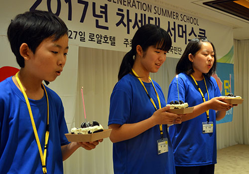 在日同胞の中・高・大学生を対象に夏休みを活用して実施された民団主催(在外同胞財団後援)の2017次世代サマースクールが7月25日の中学生を皮切りに高校、大学生コースまで11日に終えた。小学生時代、オリニジャンボリーに初参加して以来、中・高・大学コースへのリピーターも多く再会を喜びあう場面も見られた。北は北海道から南は沖縄まで全国から参加した194人は4日間、ともに学び、語り合いながら新たな絆を育んだ。「韓国の発展史」や「民団と在日の歴史」などを学んだほか、民俗村では韓服にまとって伝統に触れあった。また、グループディスカッションなどを通じて在日の仲間として連帯を深めた。  | | 韓服に着替えたあとのフリータイムで農楽のメンバーと一緒に記念撮影(9日、高校生) |  | | 3日間のグループディスカッションの発表をする大学生たち(3日) |  | | 朝鮮王朝時代の処刑台で女子たちに「お仕置き」される男子(2日、大学生) |  | | 各班に分かれてグループディスカッションをする高校生たち(8日 |  | | 期間中、民団と在日同胞の歴史や韓国発展への歴史などのカリキュラムも受けた(7月28日、中学生) |  | | 同じ班になった仲間ともすぐに解け合った(8日、高校生) |  | | 1988年ソウル五輪で100億円の募金を集めた在日同胞の後援活動を称える記念碑を見学(1日、大学生) |  | | 許槿一引率団長も加わって、集合写真を撮る大学生たち(3日) |  | | 期間中、誕生日を迎えた参加者にはバースデーケーキもサプライズ(7月27日、中学生) |  | | 期間中に仲良しになった友だちとハグをして別れを惜しむ女子(7月28日、中学生) |  | | 期間中に知り合った仲間たちと「自撮り」で思い出を残す(4日、大学生) | (2017.8.15 民団新聞) |