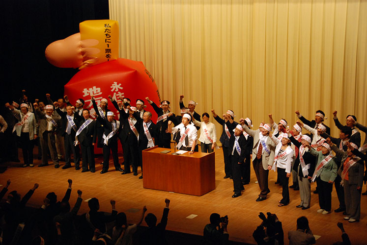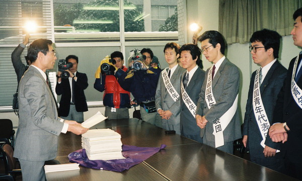 ¡¡Âè6´ü²ñŤ˰µü¶Ñ»á¤òÁª½Ð¤·¡Ö91ǯ´ÚÆüˡŪÃϰ̺ƶ¨µÄÌäÂê¡×¤È¡Öʸ²½ÁϤ»ö¶È¡×¤Î2Âç²ÝÂê¤Ë¼è¤êÁȤࡣ̱ÃĤòÃæ¿´¤ËÁ´Æ±Ë¦¤¬¸å±ç¤·¤Æ¤¤¿88¥½¥¦¥ë¸ÞÎØ¤Ç¤ÏÁ´¹ñ¤«¤éÀÄǯ700¿Í°Ê¾å¤ÎÀÄǯ¤¬Êì¹ñ¤Ë»²½¸¤·¡Ö¥½¥¦¥ë¸ÞÎØ»²´Ñ¡¦ÀÄǯÊì¹ñˬÌäÃġפò¼Â»Ü¤·¡¢Êì¹ñ¤ÎȯŸ¤¹¤ë»Ñ¤òľ¤Ë³Îǧ¤·¤¿¡£ .jpg) ¡¡88ǯ¸åȾ´ü¤ÏˡŪÃϰÌÌäÂê¤Î·¼ÌؤÈÊ»¤»¤Æ¡¢ÁÈ¿¥¶¯²½¤ò¿Þ¤ë¤¿¤á¡ÖÁÈ¿¥¶¯²½¥¥ã¥é¥Ð¥ó²ÖϺÂâ¡×¤ò¹½À®¤·¡¢ÅìËÌ¡¢´ØÅì¡¢¶áµ¦¤òÃæ¿´¤Ë½ä²ó¤·¤¿¡£¤½¤Î·ë½¸¤ò12·î¡¢¼¢²ì¤Ç¡Öµï½»¸¢¥·¥ó¥Ý¥¸¥¦¥à¡×¤ò³«ºÅ¤·¡¢¥«¥ë¥Á¥ã¡¼¥¯¥é¥Ö¤Ê¤É¤Îʸ²½¥¤¥Ù¥ó¥È¤È¡¢Ëܹñ¤Î´ÚÆüˡŪÃϰ̶¨ÄêºÆ¶¨µÄ¼Â̳ôÅö¼Ô¤ò¾·¤¡¢·Ð²áÀâÌÀ¤ò¼õ¤±¤Ê¤¬¤é¡¢Åö»ö¼Ô¤Ç¤¢¤ëƱ˦ÀÄǯ¤ÎÀ¼¤òÄ󵯤·¤¿¡£ .jpg) ¡¡¤³¤ÎÄó¸À¤òÃì¤Ë¡¢89ǯÅ٤Ϻƶ¨µÄ¤ÎÈ´ËܲþÄê¤òµá¤á¤ë¡Ö½ð̾³èư¡×¤òŸ³«¤·¤¿¡£¸ÍÊÌˬÌä¤ÇƱ˦ÀÄǯ¤Èľ¤Ë¸ì¤ê¹ç¤¤¡¢Ëܲñ¤ÎÄó¸À¤òÍý²ò¤·¤¿¤¦¤¨¤Ç½ð̾¤ò¤â¤é¤¦Áð¤Îº¬³èư¤À¤Ã¤¿¡£90ǯ1·î16Æü¡¢Á´¹ñ¤«¤é´ó¤»¤é¤ì¤¿7000¿Í¤Î½ð̾Êí¤Ï¡ÖÄľð½ñ¡×¤È¶¦¤ËÆüËܹñ¼óÁê¤ËÅÁ㤷¤¿¡£ |