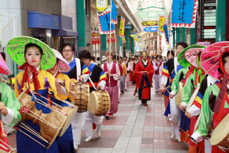 【兵庫】神戸市兵庫区で19日、「朝鮮通信使行列」が新開地本通から湊川公園までの1・5キロを練り歩いた。42回目を迎えた「神戸まつり」の一環。兵庫区では神戸まつり兵庫区協賛会が「はっぴいひろば」と題して、湊川公園とその周辺で趣向を凝らしたイベントを繰り広げた。 今年は民団兵庫支部と婦人会同支部、青年会兵庫本部に姫路獨協大学韓国語学科の学生が新たに加わり、朝鮮通信使実行委員会を構成して総勢70人でパレードに参加した。 兵庫区はかつて「兵庫津」と呼ばれた海陸交通の要所で、江戸時代の朝鮮通信使がたびたび立ち寄ったことでも知られる。民団兵庫支部は02年からまつりに主体的に関わってきた。 朝鮮通信使400周年を記念とした07年には駐神戸総領事館(当時は神戸事務所)が神戸市に朝鮮通信使衣装(正使、副使)を寄贈した。 (2012.5.30 民団新聞) |
