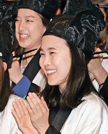 韓国の2月は卒業シーズン。中央大学国楽科の卒業生全員は18日、ソウル市黒石洞のキャンパスで朝鮮朝時代のソンビ(知識人)が着用していた衣装で式に臨んだ。