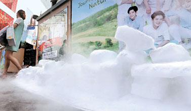 ソウルの明洞。化粧品店の前にドライアイスが積み重ねられ、通る人に涼感を与えている。ここで冷気を楽しんだ観光客は店に入り、つい買い物もしてしまう。節電のため「開門冷房」が規制され、代わって登場した客寄せアイデアだ。電気代より費用はかかるが、販促効果があり、他店にも広がりそうだ。