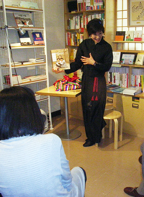 ナレーター役を務めたのは東京・荒川区の町屋図書館で定期的に子どものための読み聞かせ会を主宰している在日同胞の金順愛さん。この日のために用意した『セットンチョゴリ』、『アッパの傘』、『不思議なお母さん』など5冊を韓国語で読んだ。