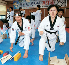 全羅北道茂朱郡のシルバーテコンド団。メンバーの平均年齢は73歳だが、全員が黒帯(初段以上)の腕前。板割の模範演技を示したカン・テグさんは85歳だ。さすがはテコンドの宗主国!