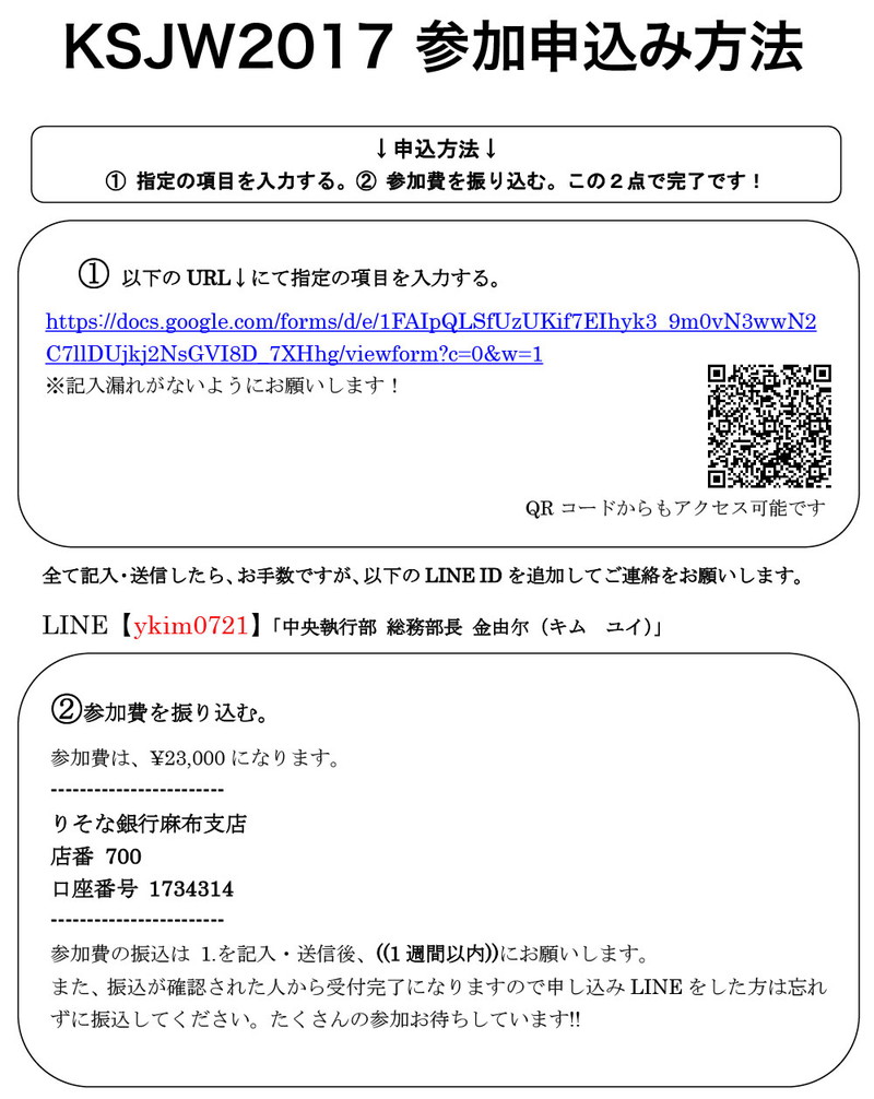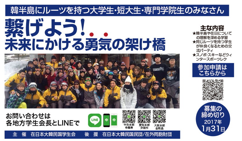 | ◇日 程:2017年2月21日(火)〜24日(金) ◇宿 所:温泉ロッヂ「野麦の里」 (長野県松本市奈川1173-106) TEL:0263-79-2244 http://www.go.tvm.ne.jp/~sato/ ◇参加費:23,000円(交通費、宿泊費、スノーボード関係のレンタル費込み) バスは東京、愛知、大阪から出発します。 その他の遠隔地方参加者はバス集合地までの交通費を一部支援します。要相談。 ◇対 象:在日の大学(院)生、専門学校生、予備校生 ◇締め切り:2017年1月31日 ◇準備品:着替え、雨具、洗面用具、タオル、ドライヤー、動きやすい服、常備薬、筆記用具、保険証のコピーなど。 ◇日程中の主な企画 会式/歓迎会/他己紹介/班活動/スノーボード/討論会/ナイトフェスティバル/韓国文化体験/班別発表 (事情により一部変更する場合もあります) |