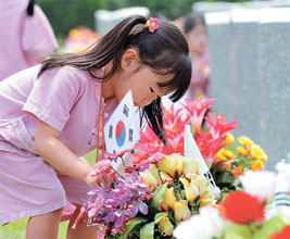 殉死者の墓前に幼稚園児の太極旗