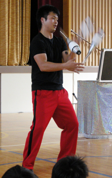 3月14日には茨木市立葦原小学校で茨木市教育委員会地域振興課と青年による人権啓発事業実行委員会共催の「スーパージャグリングショー」に出演。児童と保護者合わせて300人を前に「神技」の一端を披露した。一つの演技が終わるたびに「ウォー」という歓声と拍手が体育館いっぱいに響きわたった。ショーに先だっては、在日3世としての生い立ちをテーマにした人権講演も行い、児童に感動を与えた。
