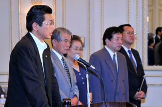 | | 仙台で開いた全国地方団長会議では被災同胞らに義捐金を伝達。被災者を代表して宮城県本部の李純午副団長が「全国からの支援は本当に心強い。皆さんの思いやりをしっかりと受け止め、がんばっていきたい」と語った(11年7月31日)
