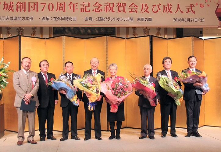 70周年を記念して国民勲章「木蓮章」を受賞した田炳樽常任顧問と大山健太郎さん(アイリスオ‐ヤマ代表取締)を表彰。梁桂和駐仙台総領事、宮城県日韓親善協会の鎌田宏会長、日韓親善宮城県議員連盟の畠山和純会長、日韓親善仙台市議会議員連盟の西澤啓文会長には金団長から感謝状が手渡された。