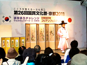 【京都】古代からの韓国と京都の友好の歴史を伝統舞踊や音楽、講演、ライブトークなどでたどる「国際交流DAY‐日韓友好祭コリアンフェスティバル」が5日、京都駅前特設広場で繰り広げられ、観衆2000人を集めた。これは日本最大の文化の祭典とされる国民文化祭の一環。第26回目を迎えた今年は10月28日から10日間にわたって京都で開かれた。 パンソリ「四節歌」を披露した民団京都本部の王清一団長は、「日本の方々に韓国の文化と歴史を広く理解していただくことは、日韓友好親善の促進に大いに役立つことと考えています」と呼びかけた。このほか、金一志韓国伝統芸術院、金姫玉韓国伝統舞踊研究所、婦人会京都府本部コーラス部、京都国際学園舞踊部、韓国伝統芸能『農謡』らが出演した。 開会にあたっては山田啓二府知事が祝辞を述べ、河久子婦人会京都本部会長が平和のメッセージを読み上げた。 (2011.11.16 民団新聞) |
