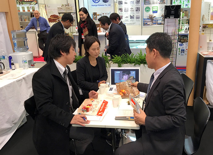 水産加工食品も目立った。全羅南道莞島郡でアワビの養殖・販売をしているチョンサンバダ社は徹底した衛生と品質管理をアピールした。同社の輸出担当者によると「莞島郡は自然環境が維持されているためアワビの育ちも良く、名産のコンブを餌としているので品質は最高」と自信のほどを見せた。
