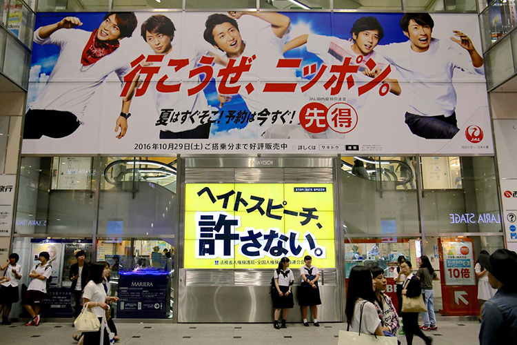 19日には大阪市と福岡市でもヘイトデモが行われた。この日は大阪市道頓堀戎橋のトンボリステーションS&Wと西鉄福岡駅のソラリアビジョンを使ってそれぞれ毎時8回、啓発スポット映像を流した。川崎市同様、両市内の主要駅構内には一斉に啓発ポスターが張り出された。法務省によれば、費用は今年度の啓発に必要な予算を充てたという。補正予算は組んでいない。
