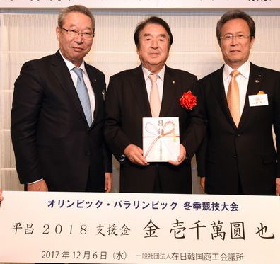 一般社団法人在日韓国商工会議所(韓商連)の金光一会長と朴義淳代表理事は6日、民団が展開している平昌冬季五輪誠金活動に対して1000万円を中央本部の呉公太団長に伝達した=写真。