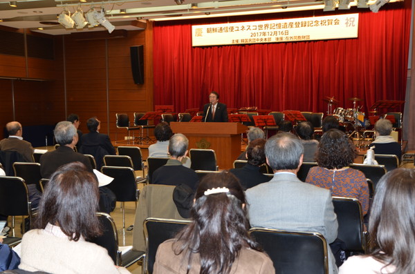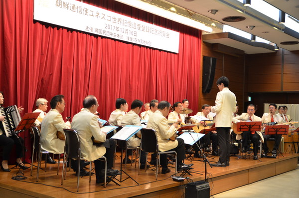 | | あいさつを述べる呉公太団長 | | | 明治大学マンドリンOB倶楽部による祝賀演奏 | 民団中央本部は昨年12月16日、東京・港区の韓国中央会館で朝鮮通信使に関する記録のユネスコ世界記憶遺産登録を祝うイベントを開催。民団関係者と日本側関係者合わせて100人余りが参席した。