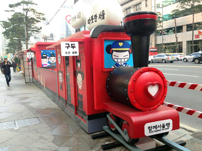 新聞、飲み物、たばこ、軽食のほか、くつみがきなど、ソウルの街角で見かけるボックス型売店が大きく様変わりした。コンビニの普及でその数が減ったものの、まだまだ健在で明洞ロッテデパート前にお目見えしたのが蒸気機関車をイメージした売店。