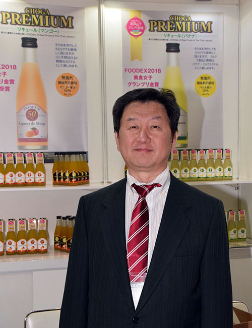 | | リキュール・デ・マンゴとリキュール・デ・バナナの展示コーナーに立つ草家の李昌浩代表