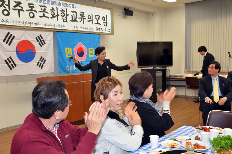 懇親会では9月にソウル市内のホテルで開催されたKBSノレチャラン(のど自慢)韓人世界大会で「最優秀歌謡大賞」に選ばれた尹徳順さん(川越市、民団西部支部団員)がパンソリで鍛えたのどで大賞受賞曲の「新萬古江山」を熱唱した。
