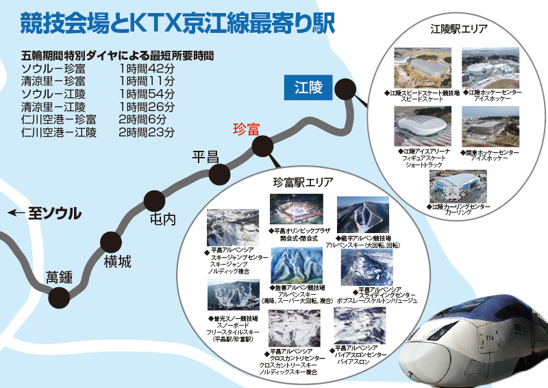 | | 12月21日、江陸駅で行われたKTX京江線の開通式 | | | KTX京江線一番列車で江陸駅に到着した乗客たち | 会場への足 乗心地も上々 平昌五輪の競技会場エリアとソウルや仁川国際空港などを結ぶ高速鉄道のKTX京江線が12月22日に営業開始した。