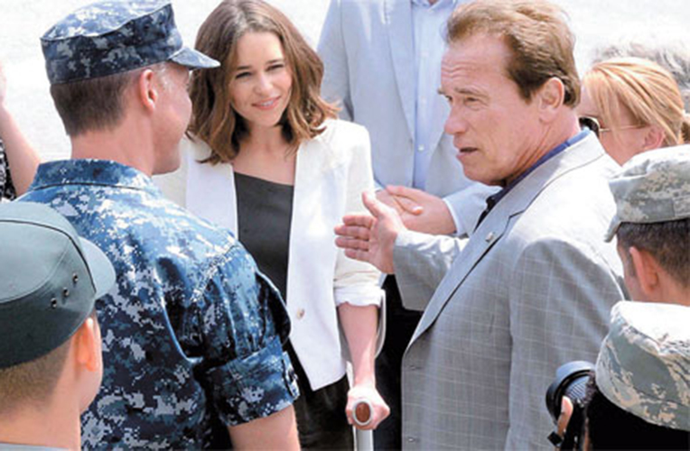 映画「ターミネーター 新起動/ジェニシス」広報のため訪韓した俳優のアーノルド・シェワルツェネッガーとエミリア・クラークが3日、板門店を視察し、共同警備区域(JSA)安保見学館前で米軍関係者から説明を受けた。(2015.7.8 民団新聞)