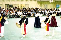 つどいでは、一昨年に全羅南道立として設立された長興大学の李永権学長はじめ国楽科のメンバーら16人が来日、農楽、サムルノリ、パンソリなど韓国伝統の芸術を披露し、市民を魅了した。日本側からは和太鼓の「火の国源流太鼓」、大牟田ジュニア合唱団、音楽家協会による声楽やピアノ演奏が会を盛り上げた。