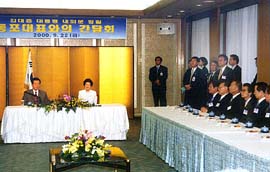 | 金大中大統領夫妻を迎えて行われた 民団幹部代表との懇談会で 歓迎のあいさつをする金宰淑団長(右側) |