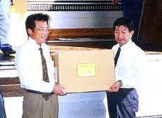 民団側からは金昌男県本部団長、孫泰欽事務局長が、総連からは朴吉薫県本部委員長らが参席し、双方が持ち寄ったくつした、ハンカチ7万5000枚ずつを段ボール箱400個に詰めて10dトラックで発送した。