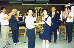 【大阪】白頭学院建国学校の第14期卒業生、韓成珍さん(大阪市生野区、医療法人第一医院院長)が13日、母校の建国中・高校を訪れ、吹奏楽部の後輩たちにとチューバなど100万円相当の楽器をプレゼントした。韓さんは昨年も同校にティンパニなど200万円相当の楽器を寄贈しており、2年連続の贈り物。
