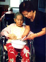 その第一弾として婦人会東成支部(玄成花会長)の会員10人が23日、故郷の家を訪れ、お年寄りたちの入浴誘導やおやつの配膳手伝い、話し相手としてみっちり働いた。痴呆症のお年寄りが徘徊しないように手を握りながら話しかけたり、車イスをつかって浴室まで誘導し、入浴の支援に当たったりと、汗びっしょりになりながらボランティア活動を続けた。