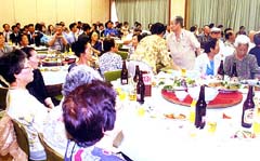 双方の婦人会員の手作り料理が並べられたテーブルには、民団、総連関係なく入り交じって座り、ビールやジュースで乾杯した。婦人会や朝鮮初級学校の児童がノレや舞踊を披露し、お年寄りの目を楽しませた。