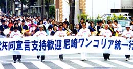 【兵庫】8日に行われた第29回尼崎市民まつりに民団と朝鮮総連が統一チームで参加し、脚光を浴びた。2時からスタートしたパレード(七松小学校から五合橋線までの約1q)には、尼崎ワンコリア統一行進団として36番目に出発。李鎭午民団尼崎支部支団長、厳守鎬総連尼崎東支部委員長、呉勝弘同西支部委員長ら8人の組織幹部が「南北共同宣言支持歓迎・尼崎ワンコリア統一行進団」とい書かれた横断幕を交互に持ちながら先頭に立ち、民団の農楽隊、ブラスバンド隊、朝鮮学校の舞踊団、と続いた。沿道を埋めた市民からは惜しみない拍手、声援が送られた。