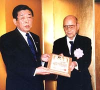 金大韓体育会長から功労碑を 受け取る蔡在日大韓体育会 名誉顧問(右) |