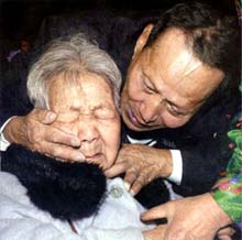 11月30日、平壌で北韓に住む息子(75歳)と 再会を果たした韓国側代表団最高齢者 100歳の柳斗喜さん(左) |