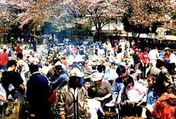 民謡が流れ出すと、オモニやアボジに混じって青年までもが踊り出し、雰囲気を盛り上げた。公園を通る日本の市民も足を止めて同胞の交流風景に見入っていた。民団系の同胞は「毎年続けて行くことが肝心だ」と述べ、総連系のオモニも「初めて合同の花見ができた」と喜んでいた。