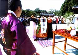 韓国庭園内では、この日に伝統様式で挙式したいと願い出た青年会員の式が行われた。親族や関係者だけでなく、同胞や日本市民らも伝統的な挙式を満喫していた。