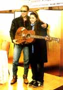 | ギターを手にして長渕さん(左) と喜ぶ参加者 |