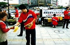 | | 横浜駅前でビラなどを配る青年会のキャラバン隊 |