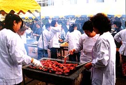 煙でもうもうとする会場は、一人五百円の入場料で四人前まで食べ放題とあって、家族ぐるみでの参加が目立った。