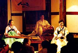散調は1980年頃、金祥祚によって創られたソロ楽器による音楽のスタイルで、ゆっくりとしたテンポから徐々に早いテンポへと移行していき、即興性を持っているのが特徴。それまでの音楽は"聞かせるためのもの"つまり貴族の宴や儀式に奏でるものだったが、散調は自分の感情を素直に表現した音楽だった。そのため、最初は卑しい音楽と蔑まれたが、この100年の間に、芸術の域にまで高められた庶民の音楽だ。