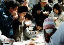 | 95年の阪神淡路大震災発生では被災地区民団支部の前で大がかりな炊き出しなど、救援活動を展開した |