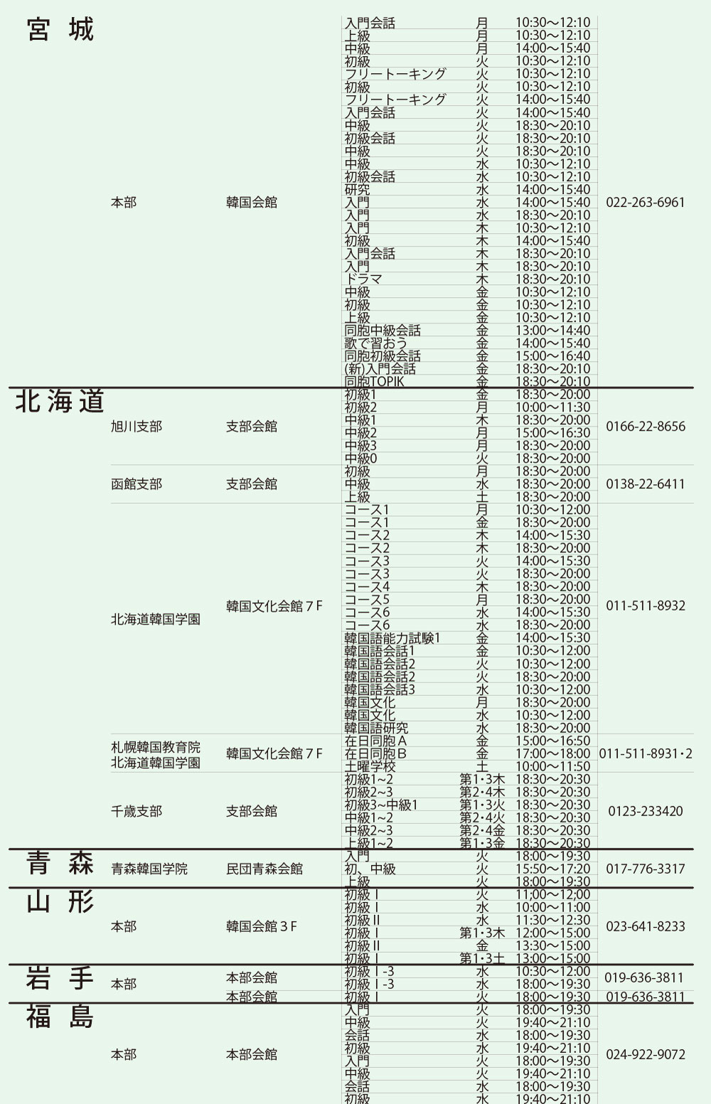 2018年度 各地の韓国語教室<東北・北海道> 宮城/北海道/青森/山形/岩手/福島