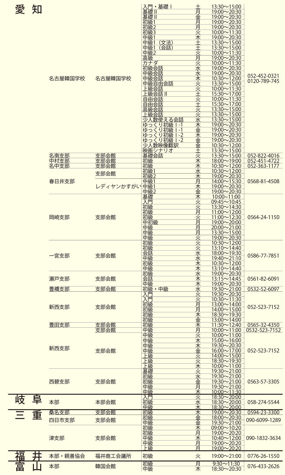 2018年度 各地の韓国語教室<中北地区> 愛知/岐阜/三重/福井/富山