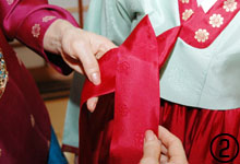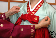 ■□ @ソクパジ、ソクチマ、ポソンを着けた後、チマを着る(チマの両端が後)。右側のチマの端を表にして、左側の紐を右肩紐の下から取り出し、胸上で結ぶ。【ポイント】ソクチマとチマの肩紐はずれないように重ね合わせる。 A襟元を合わせてホックを留める。左右のコルムを各手で持ち、右の短いコルムを上にしてX字型に重ねる。 B短いコルムを左の長いコルムの下から巻き込んで表に出し、Cひと結びする。 D上にある短いコルムを左手に巻き付けて輪を作る。 E長いコルムを右手に持ち、結び目に近い部分を2つ折りにして輪の中にいれて引き出す。 F左手でコルムの輪を押さえ、右手で短いコルムと長いコルムを引きながら、形を整える。【ポイント】真中の結び目は、コルムの幅と同等になるのが目安。引き出したコルムの長さは、耳の外側の長さに合わせるとバランスが良い。 Gコルムの結び目は解けやすく、輪が上部を向くこともあるので、輪の内側に安全ピンを刺してチョゴリに固定する。ブローチなどは使用しない。 H仕上げはチョゴリの首の付け根部分にあたるキッ(襟)から袖脇下に向かって布を軽く持ち上げ、外側の布を中に折り込む。【ポイント】最後の仕上げは、胸元の無駄なしわを省いて綺麗に見せる。