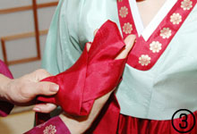■□ 「韓服はシンプルだからこそきちんと着てほしい」と話す李瑛子さん。 伝統衣装である韓服の美しさは、柔らかく優雅な曲線と直線の調和にある。だが着付けやマナーを知らないために、せっかくの韓服も野暮ったく見えることがある。 外観を綺麗に見せるためのポイントを心得ていれば華麗な美しさを引き出せるのでぜひ実行したい。 なかでもチマのふくらみを出し、肌の露出を防ぐ下着は重要になる。まずソクパジ(下肌着)、チマの形を整えるスカート型のソクチマを着た後、ポソン(足袋)を履く。昔、下着は何枚も重ね着したが、時代とともに枚数も減ってきた。最低このソクパジとソクチマ、ポソンを揃えよう。 ソクチマはチマより2、3a短いものを選ぶこと。ポソンの左右を見分ける方法は、縫い目の内側の縫い代(5_程度)が右外側に向けば右足に、左外側に向けば左足に履く。 髪型はチョゴリの襟のV字形の美しさを引き立たせるために,小さくまとめる。アクセサリーは小さめのイヤリング、指輪、ノリゲ程度におさえたい。ネックレスは首もとの美しさを損なわせるので付けないほうが良い。 韓服にハイヒールやサンダルを履く女性を見かけるが、これはぜひ避けたいもの。なんといっても韓服の美しさは全体のバランスが重要なので、シン(靴)をお薦めする。絹に花模様を施した刺繍コッ(花)シン、ゴム製やヒール型などもあるので、韓服に合わせたい。 頭から足先まで神経を配ってこそ、美しさが引き立つ韓服。ぜひポイントを覚えて着こなしたい。