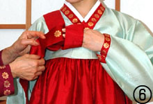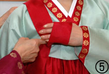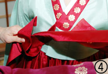 ■□ 人混みや狭い空間、また階段などを利用するとき、その場に応じた身のこなしかたがある。チマをコンパクトにおさめると邪魔にならず、スマートにも見える。さり気なくするのがポイント。 @左側のチマの端(裾からチマの1/3部分)を持つ。端を持ったまま、コルムの結び目の下まで持ち上げ、左の二の腕で軽く押さえる。チマの膨らみを押さえることができるので、人混みや狭い空間でも気にならない。 A階段や車を利用する場合、@を維持しながら左手で左膝上のチマとソクチマを一緒につかみ上げると、シン(靴)の先が出るのでチマに引っかからない。 |