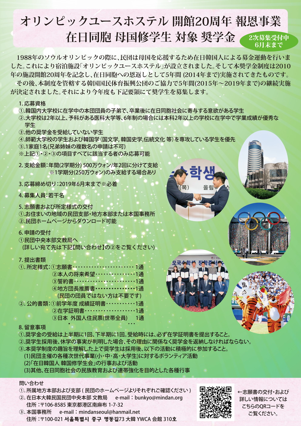 [オリンピックユースホステル 開館20周年 報恩事業 在日同胞 母国修学生 獎学金 実施要領PDF版]