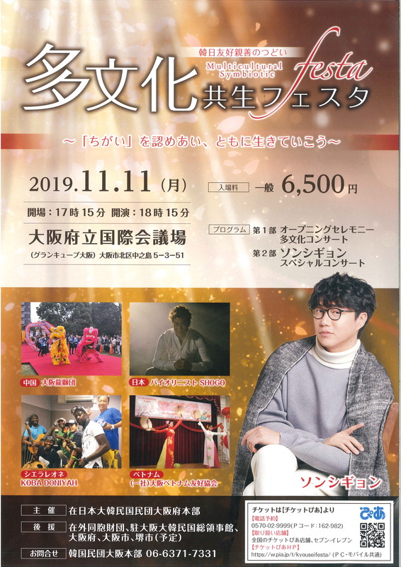 民団大阪本部主催による「韓日友好親善のつどい~多文化共生フェスタ」を11月11日(月)にグランキューブ大阪にて開催いたします。今年は韓国の国民的バラード歌手「ソンシギョン」さんをスペシャルゲストに招き、日本、ベトナム、中国、アフリカなどの多文化コンサートを準備いたしました。多くの方のご来場を心よりお待ちしております。