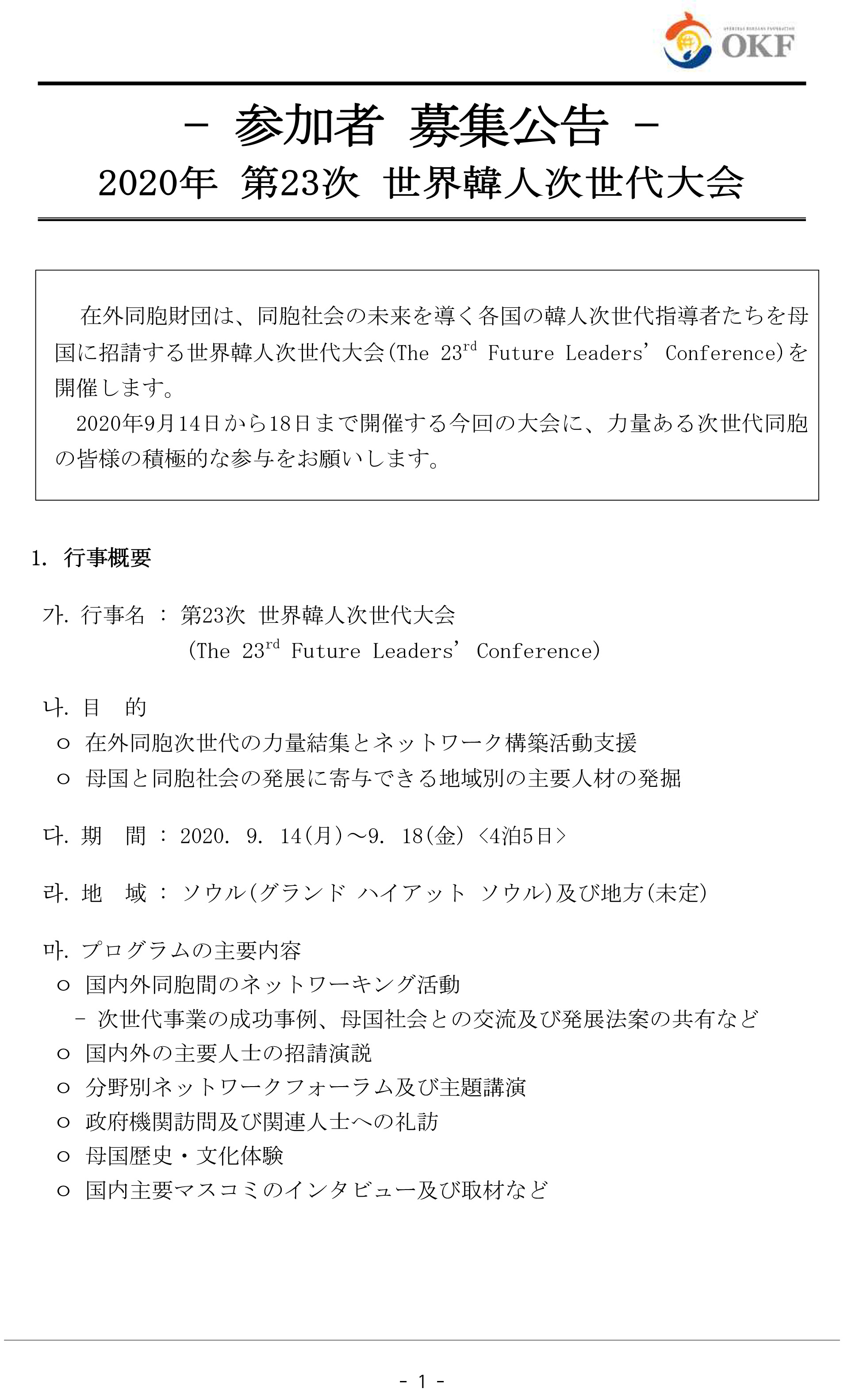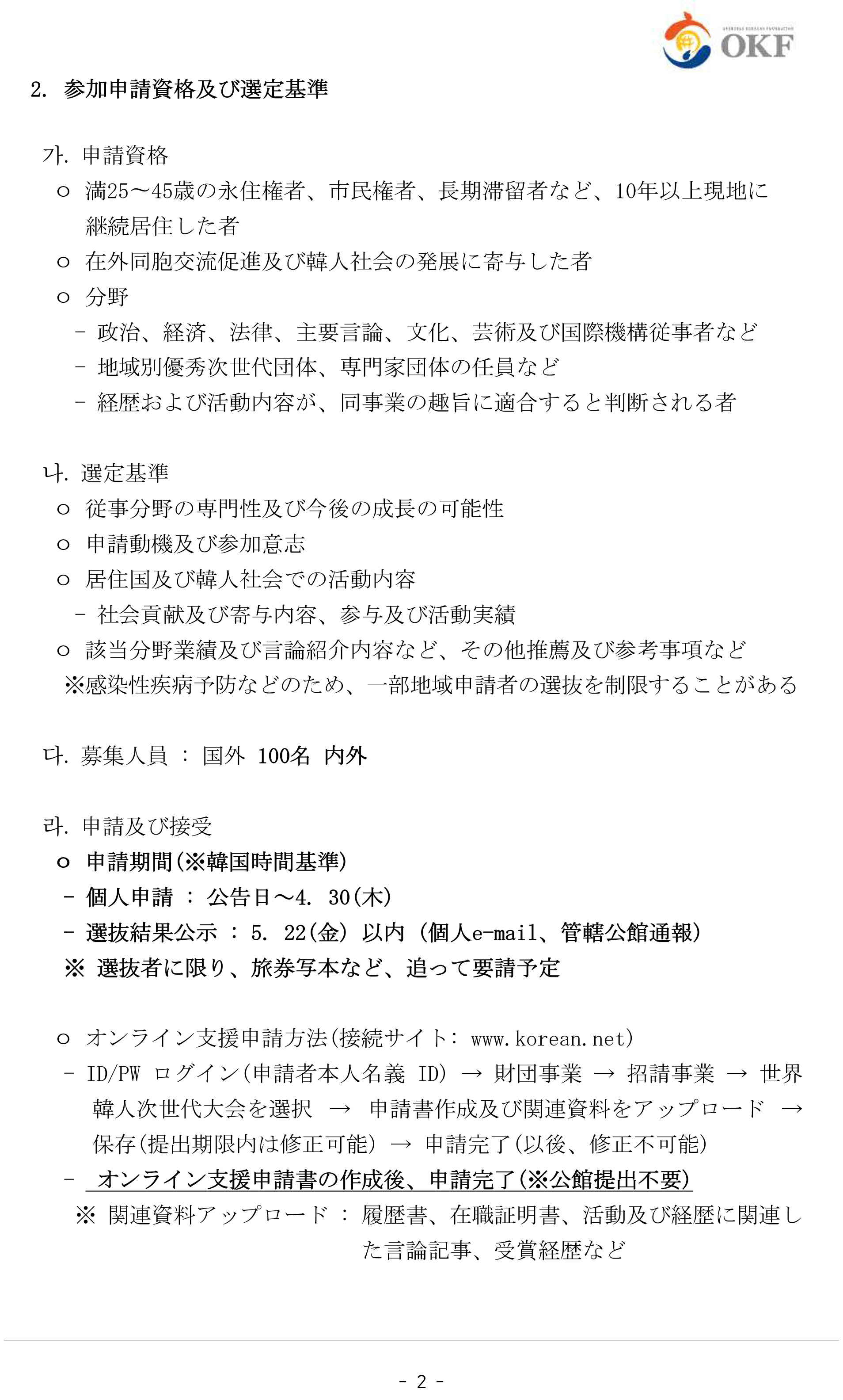 第23期 在外同胞招請奨学生(OKFellowship) 選抜要綱