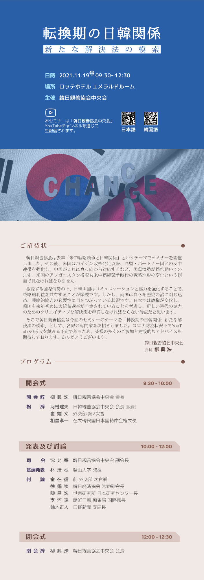 【韓日親善協会】転換期の日韓関係: 新らたな解決法の模索” セミナー 開催案内