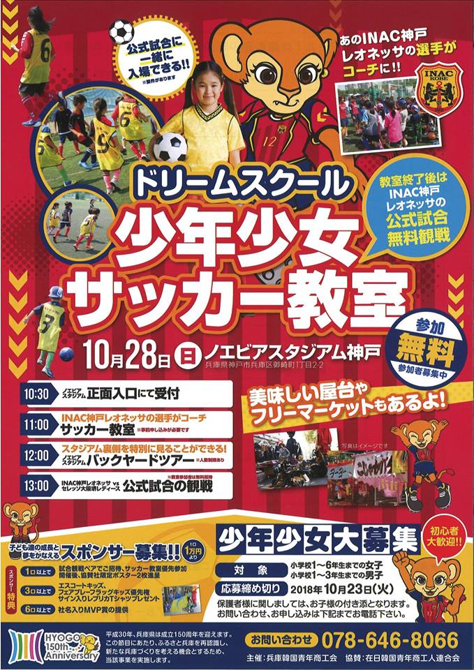 兵庫韓国青年商工会(宋英鎬会長)は28日、神戸市兵庫区のノエビアスタジアム神戸で少年少女サッカー教室「ドリームスクール」を開催する。受講生を募集中。